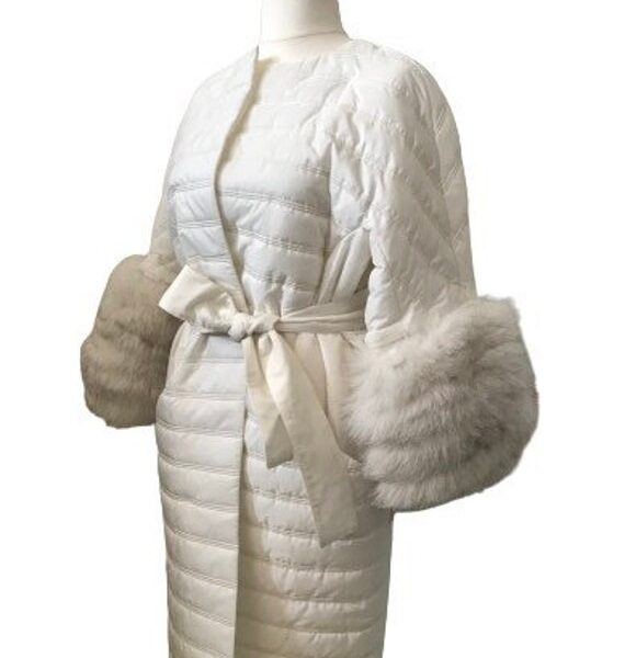 Women White Quilted Coat Fox Fur Sleeves Transformers, Stand with Ukraine