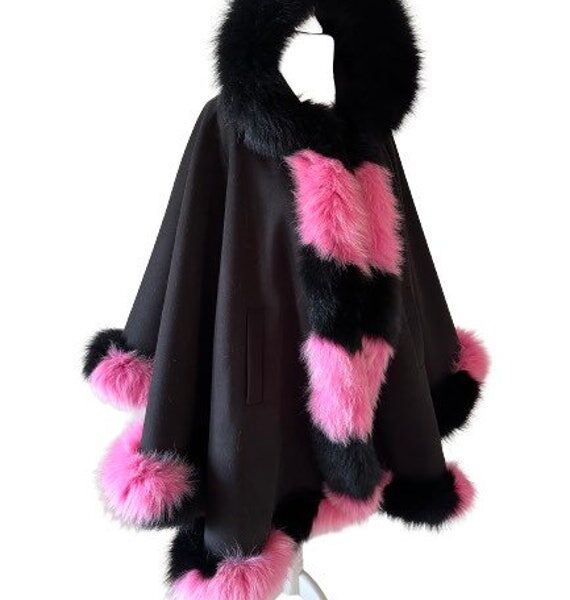 Black Pink Women Winter Coat Cape Trim Fox Fur, Winter Women’s Poncho Jacket lined, Warm Women’s coat with a hood