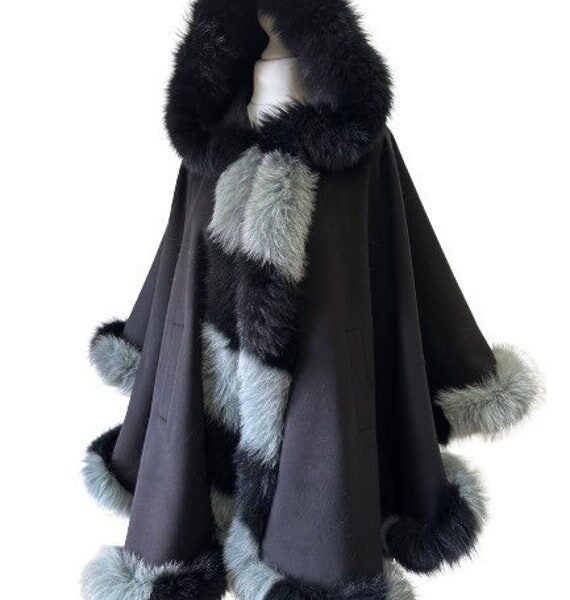 Black Women Winter Cashmere Coat Cape Trim Fox Fur, Winter Women’s Poncho Jacket lined, Warm Women’s coat with a hood