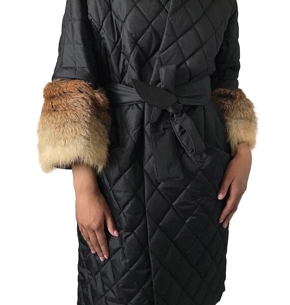 Women Black Quilted Coat Fox Fur Sleeves Transformers, Stand with Ukraine