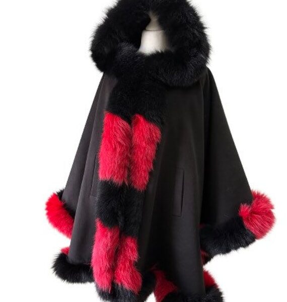Black Red Women Winter Coat Cape Trim Fox Fur, Winter Women’s Poncho Jacket lined, Warm Women’s coat with a hood