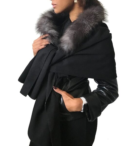 Women Black Scarf Stole Cape Wraps Cashmere and trim arctic fox fur