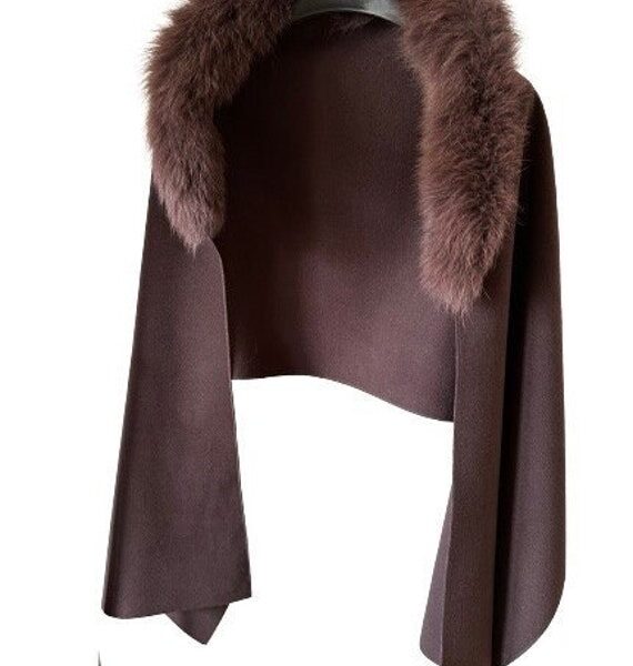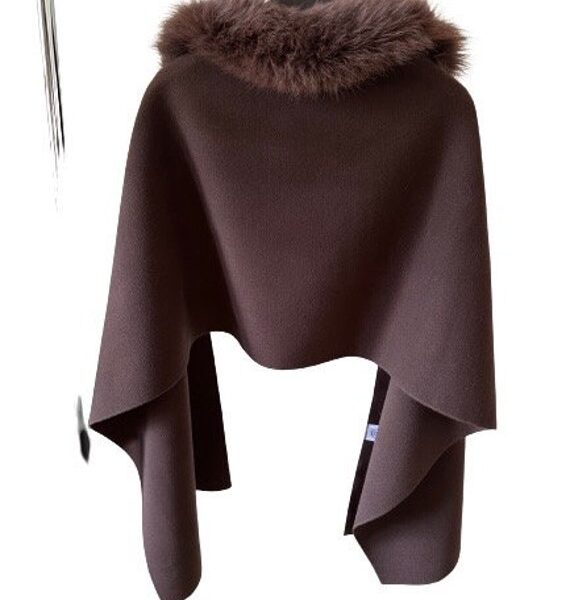 Brown Women Scarf Stole Cape Wrap Trim Fox Fur, Extra Large Shawl, Winter Gift, Cashmere Woolen blend Cape Scarf